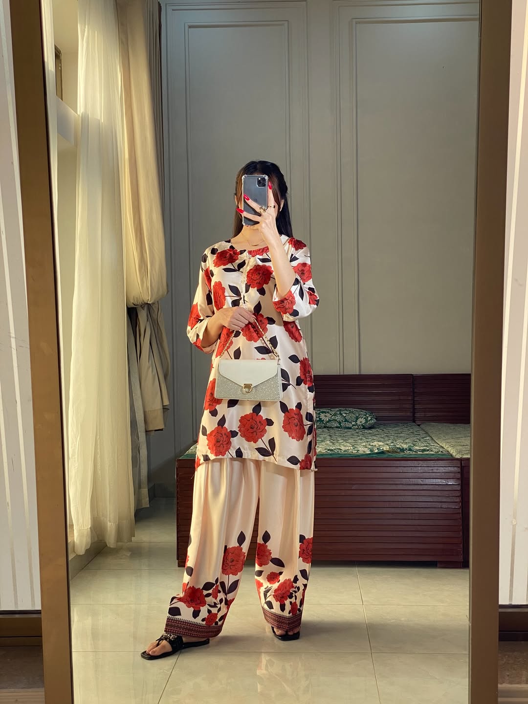 We are committed to beauty for all. This Shamooz silk suit is thoughtfully available in three sizes: Small (S), Medium (M), and Large (L). Please refer to our detailed size chart (link to size chart) to select the perfect fit for your body type, ensuring maximum comfort and confidence.